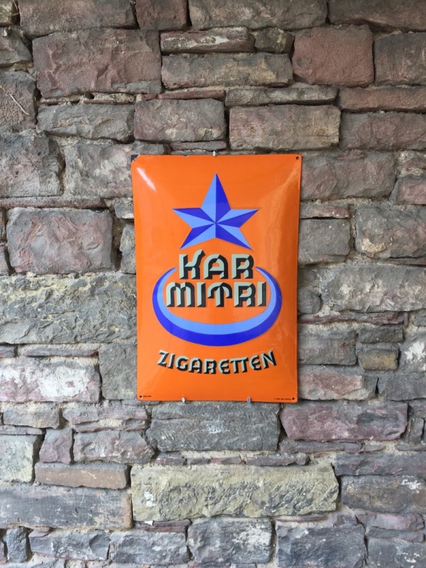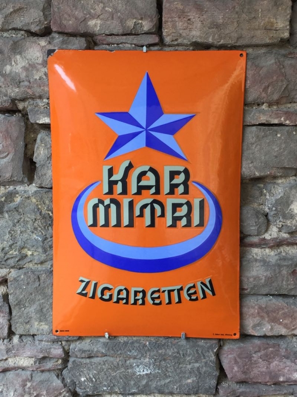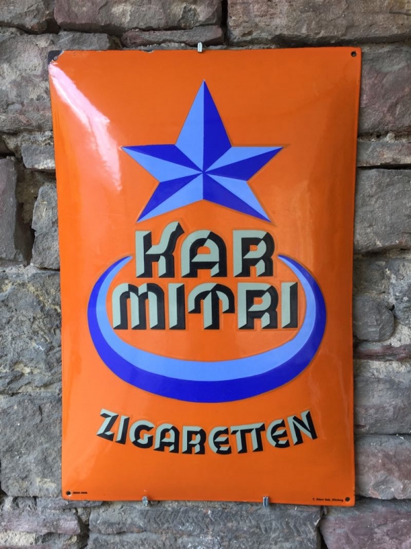 …..KARMITRI ZIGARETTEN, Emailschild, C.Robert Dold Offenburg ~ 1920…..