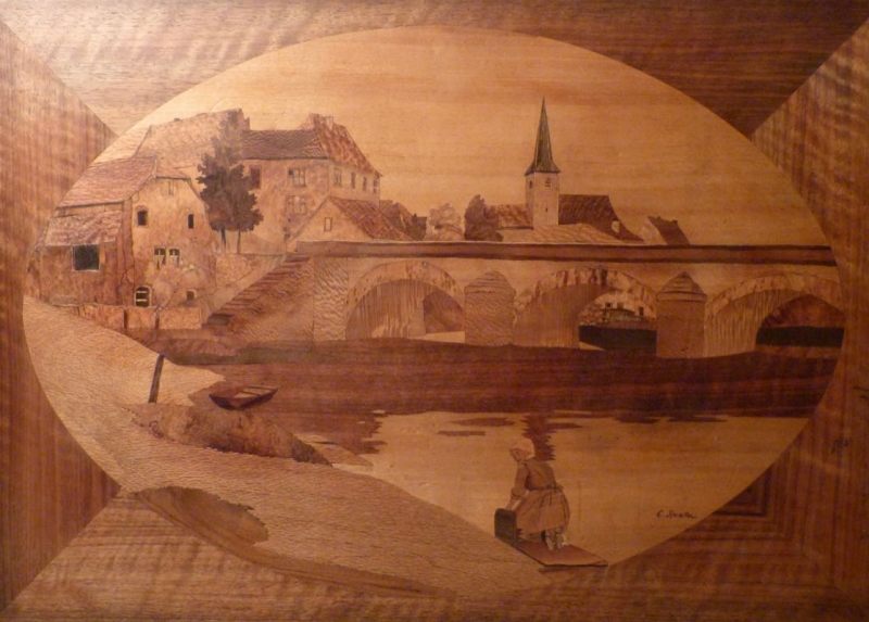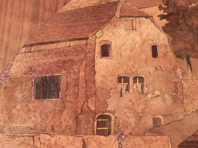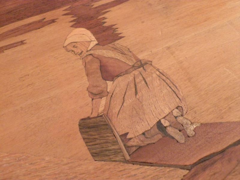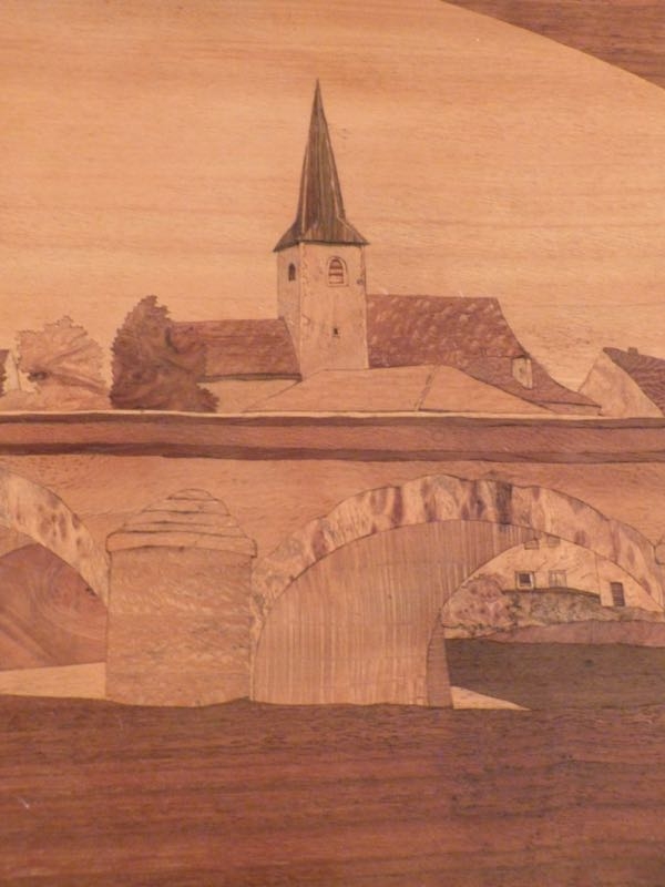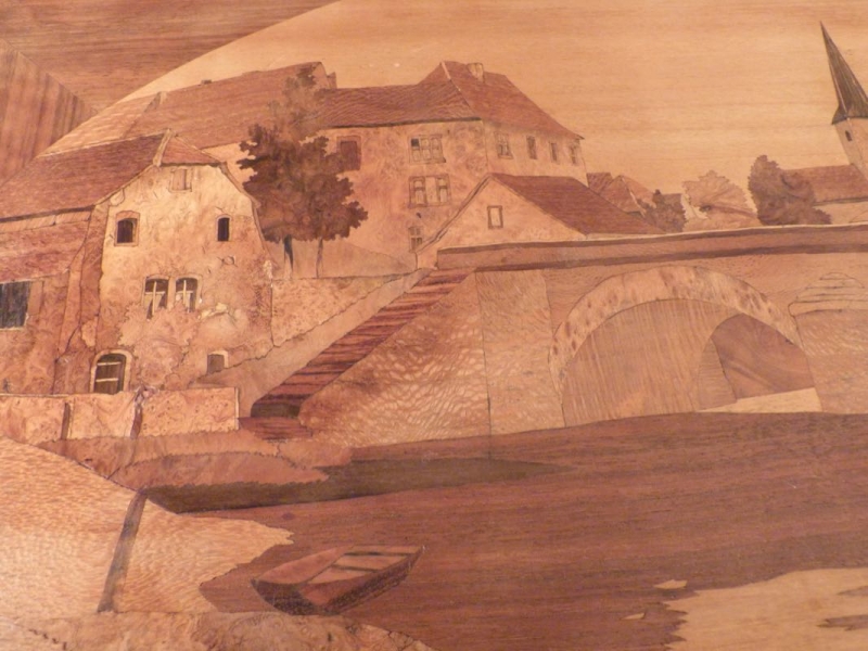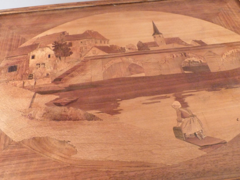 obere Platte mit qualitätvoller Marketerie, ländliche Dorfszene