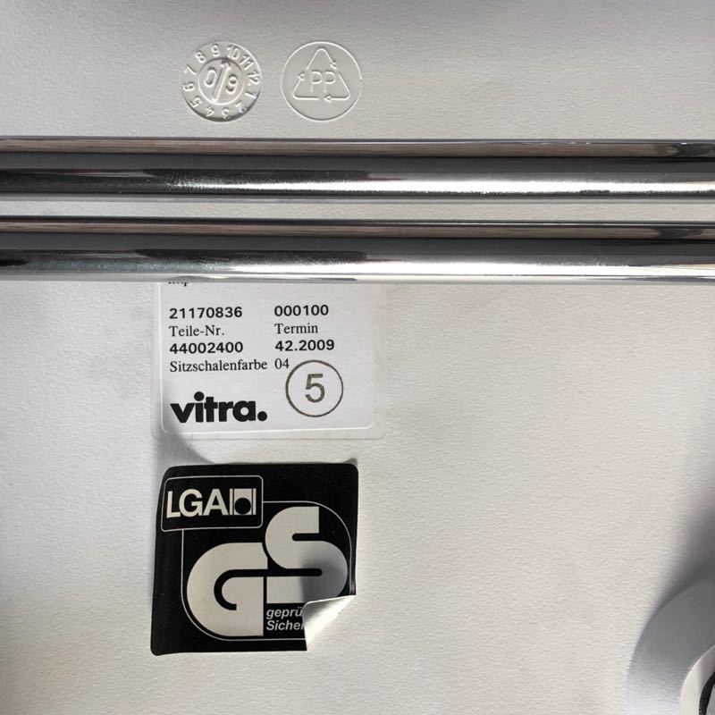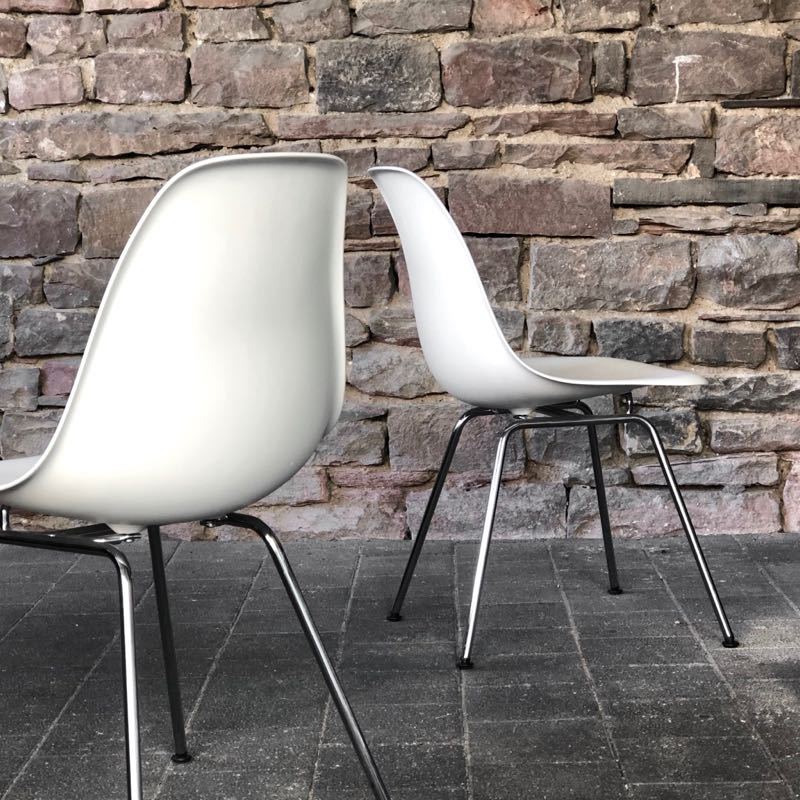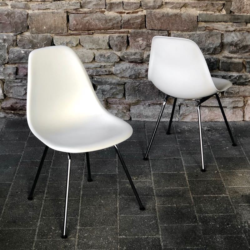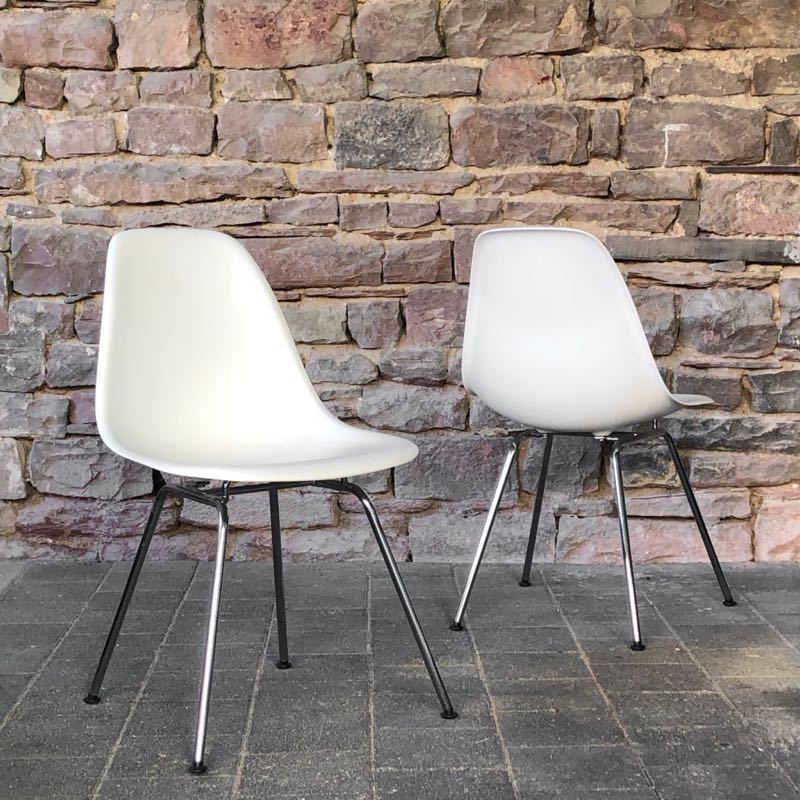 …..2 DSX Plastic Side Chairs, Vitra 2009….. Entwurf: Ray & Charles Eames weiße Sitzschale, Gestell Glanzchrom, Gleiter schwarz HxBxT: 80 x 46.5 x 55cm, Sitzhöhe ca. 43cm sehr guter Zustand, minimale Gebrauchsspuren verkauft/sold