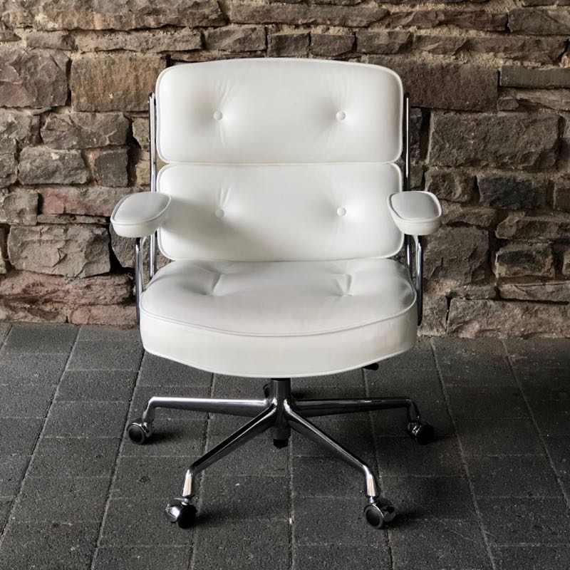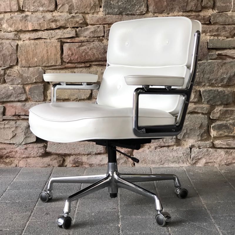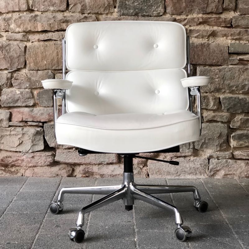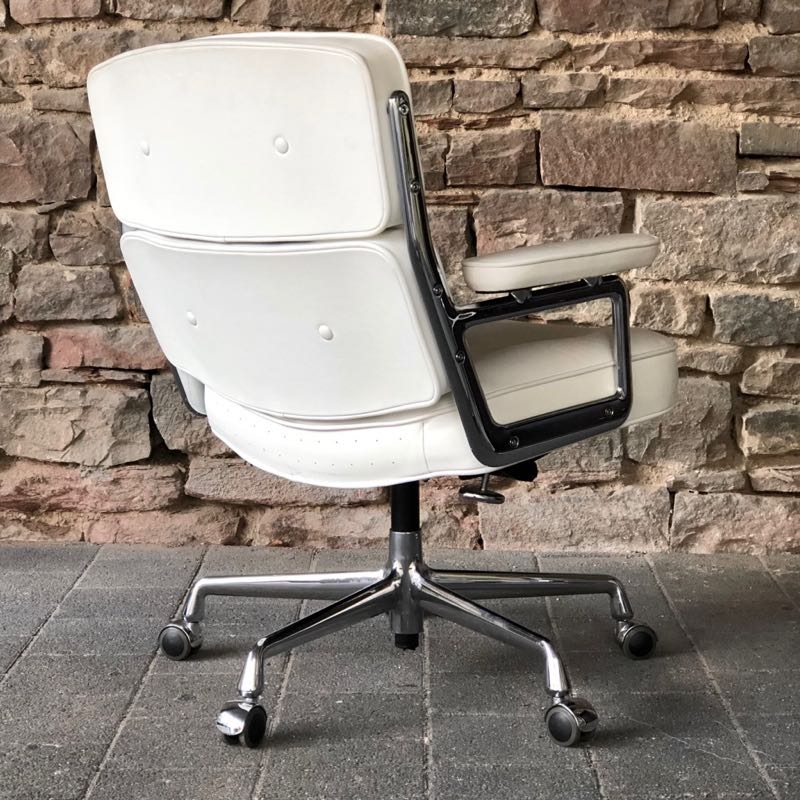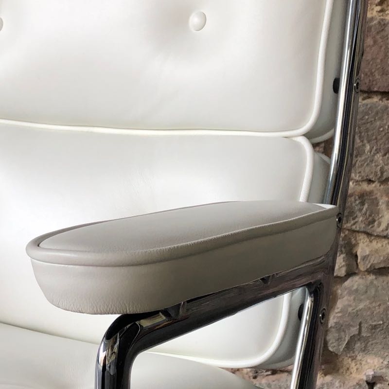 …..Lobby Chair ES 104, Vitra 2008….. Design: Charles & Ray Eames Chromgestell, Leder weiß höhenverstellbar, rollbar, einstellbarer Wippmechanismus top Zustand, minimalste Patina verkauft/sold