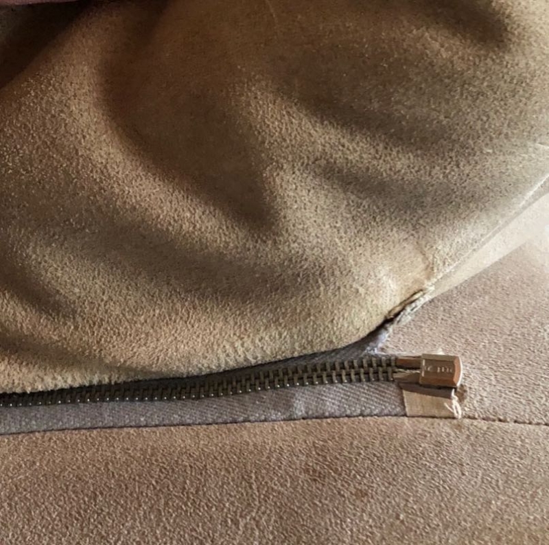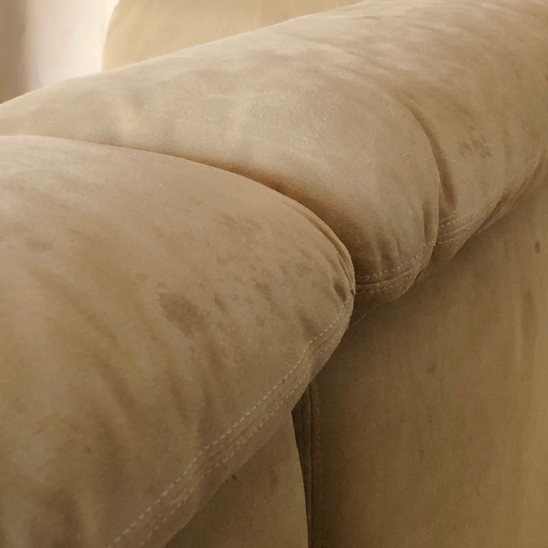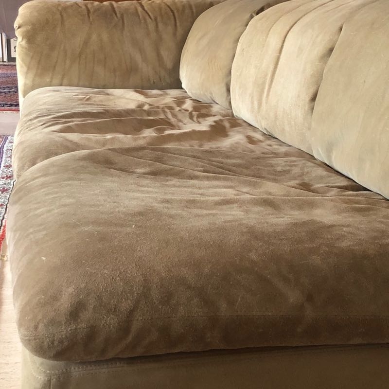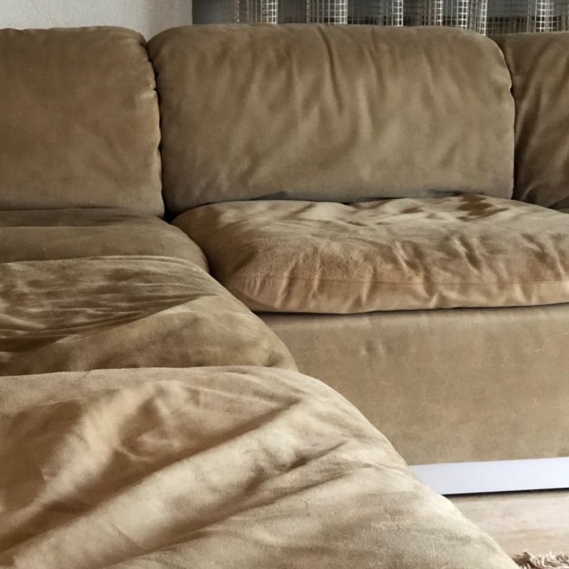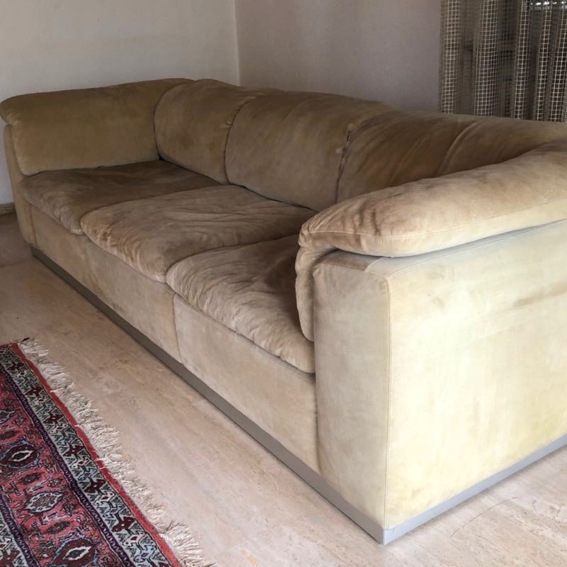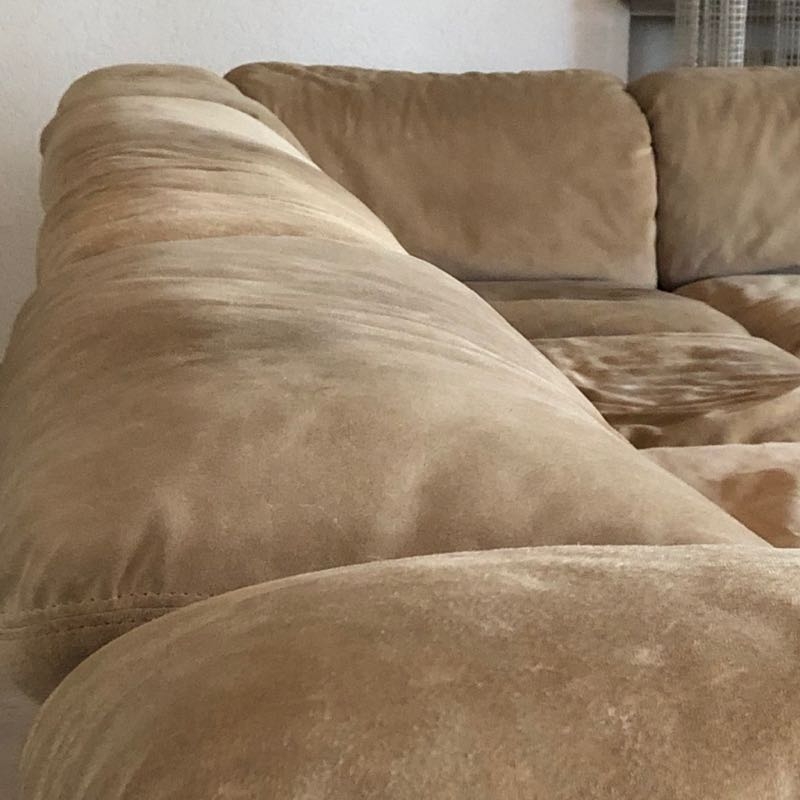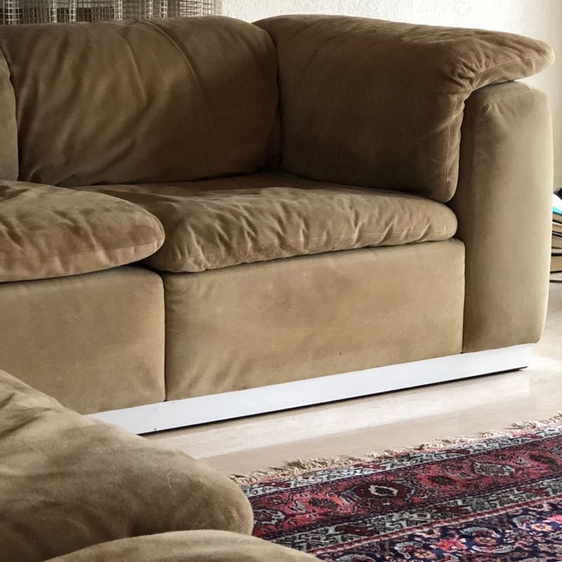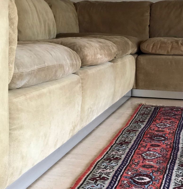 Sockel aus Holz mit Chromleiste, sandfarbenes Wildleder