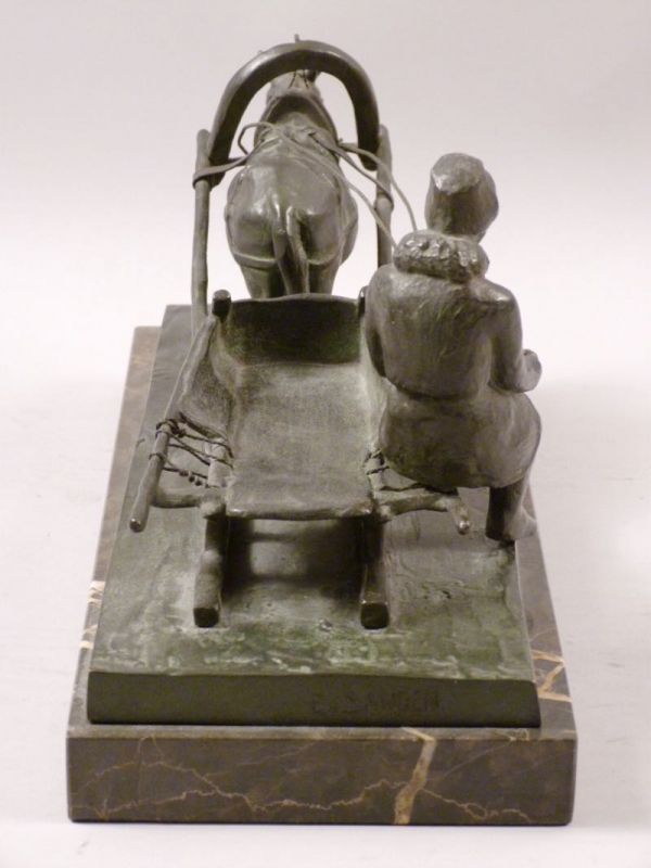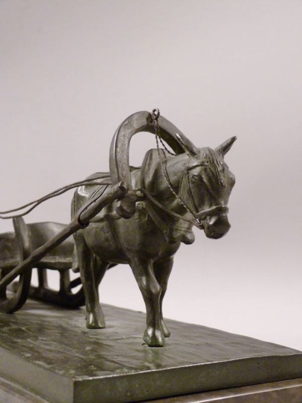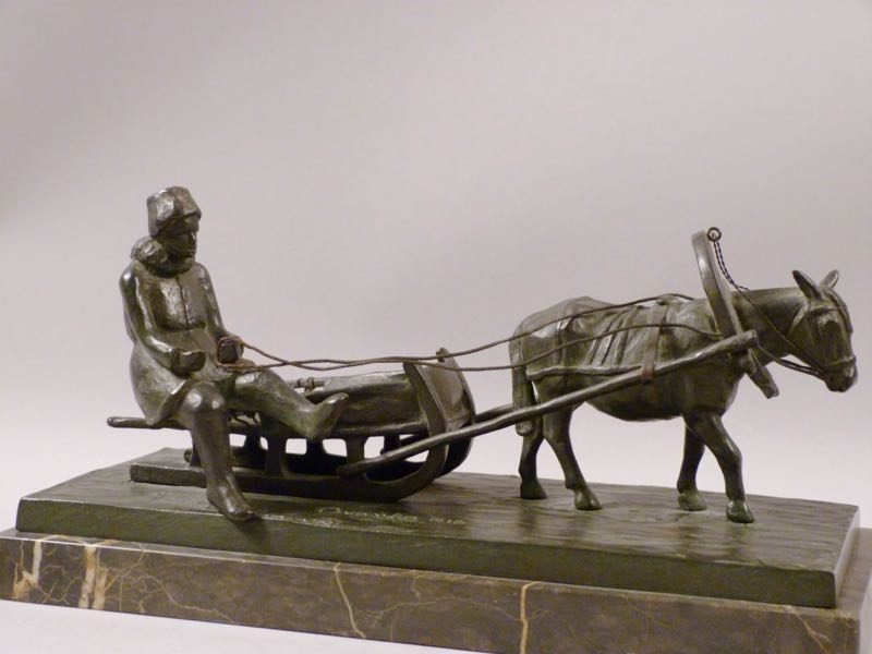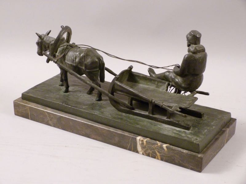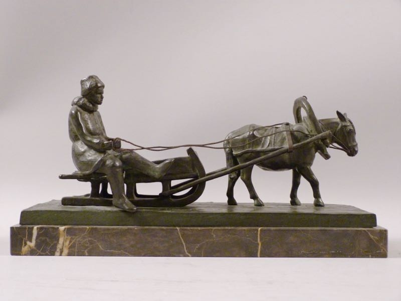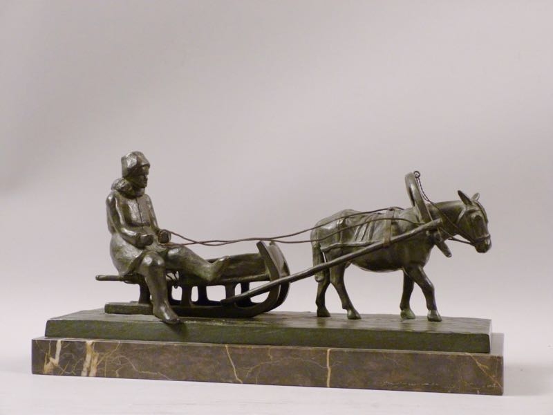 qualitätvolle Bronze von 1918, Schlittengespann mit Esel