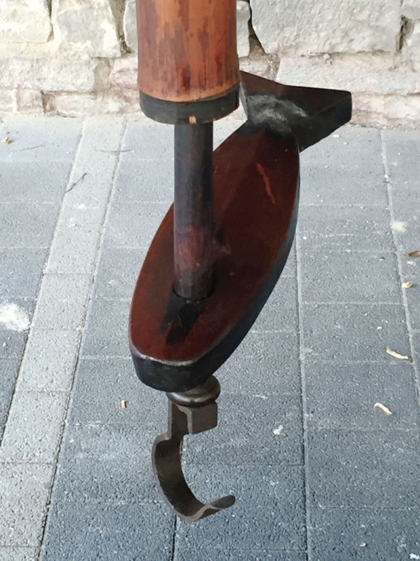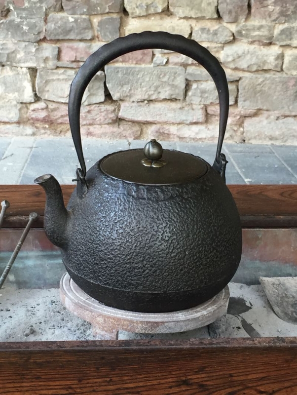 mit Eisenhaken und hölzernem Fisch (Glückssymbol) an Bambusstange für den Teekessel (chagama)