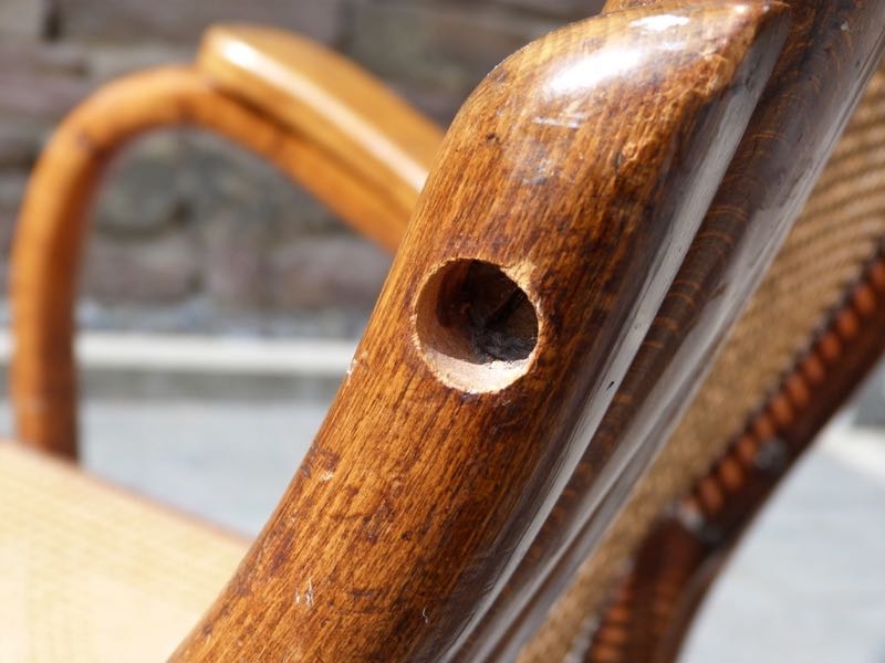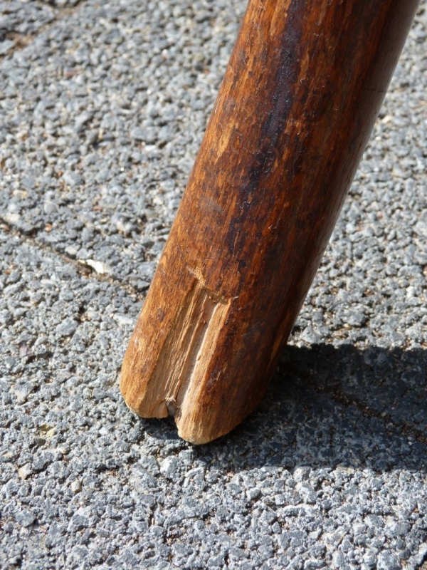 ein Bein vorne mit kleiner Fehlstelle (Foto), eine runde Holzkappe fehlt (Foto)