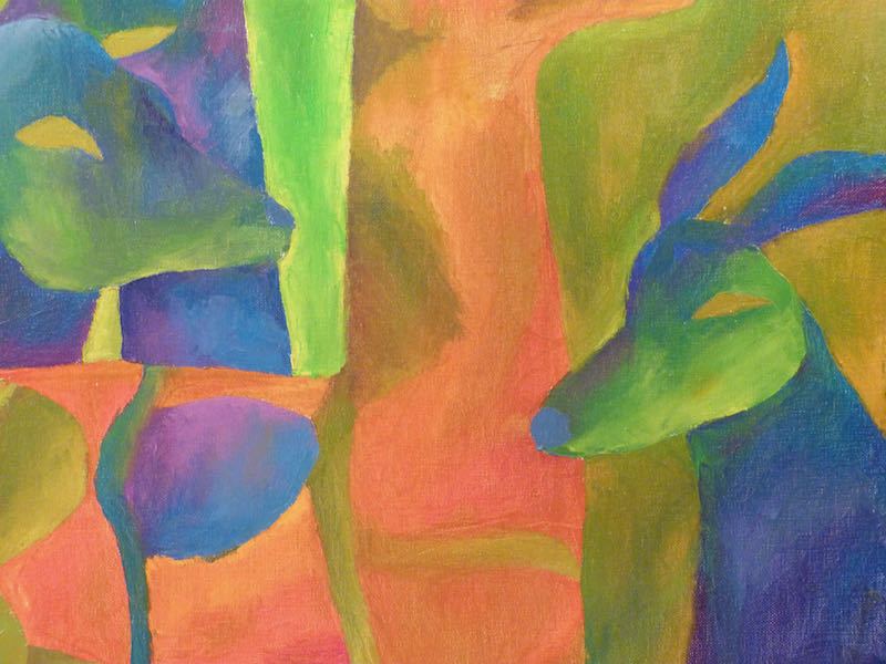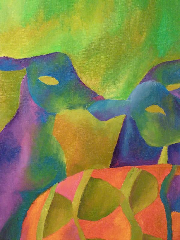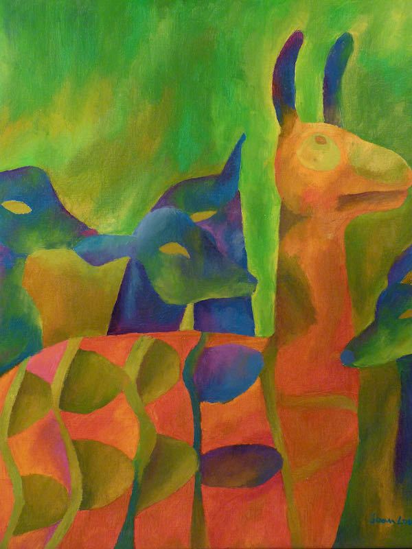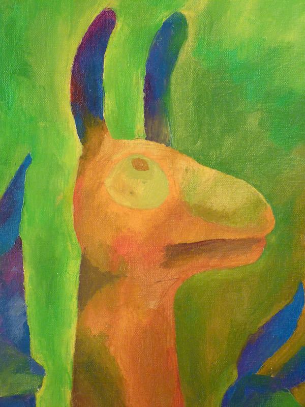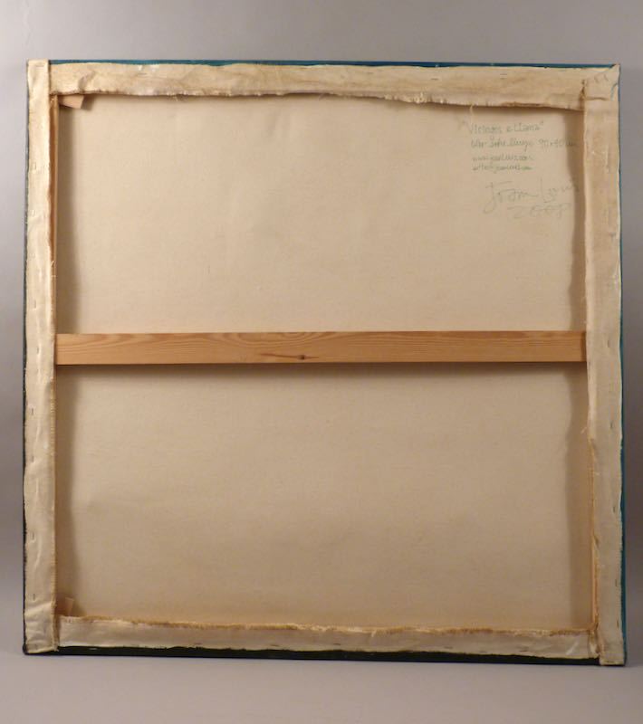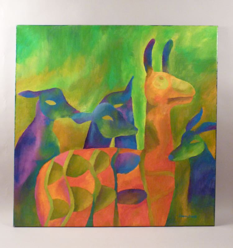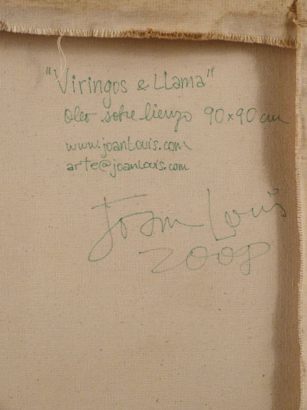 JOAN LOUIS 1982 Chiclayo/Peru – lebt in Karlsruhe großes Ölgemälde von 2008, „Viringos & Lama“ 90 x 90cm rechts unten signiert rückseitig datiert und bezeichnet verkauft/sold