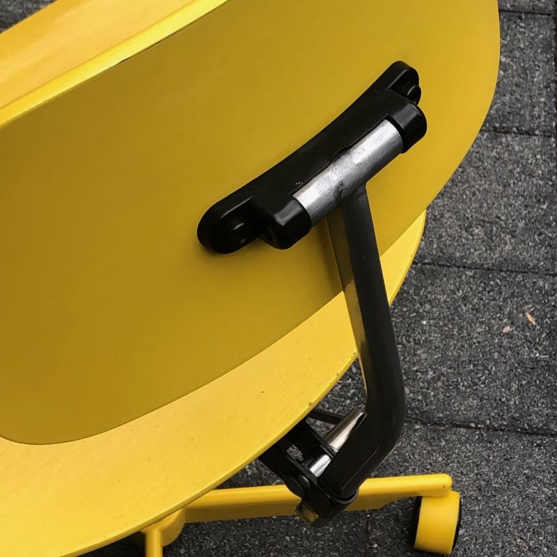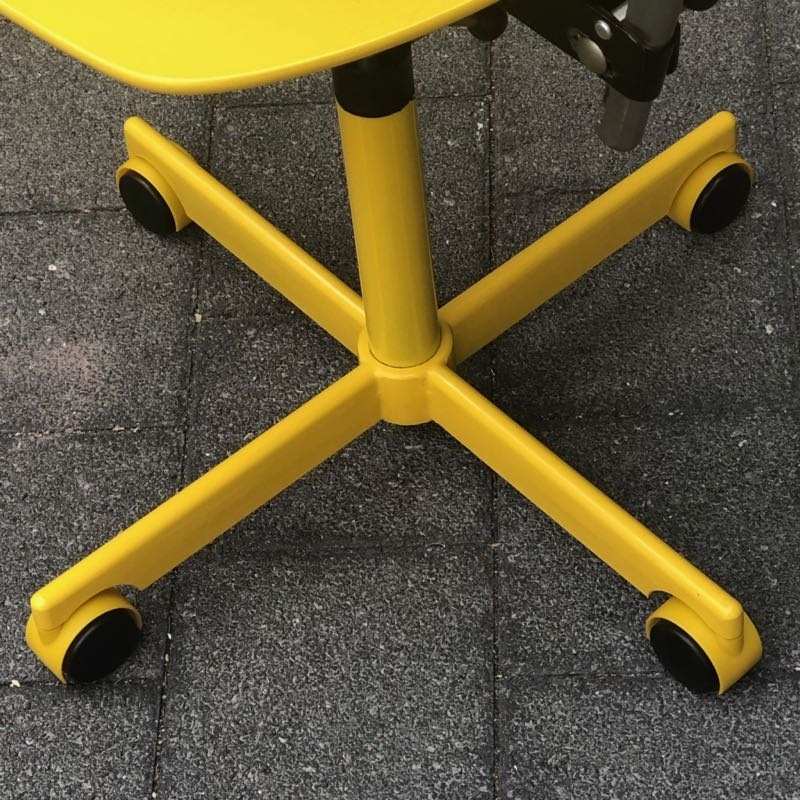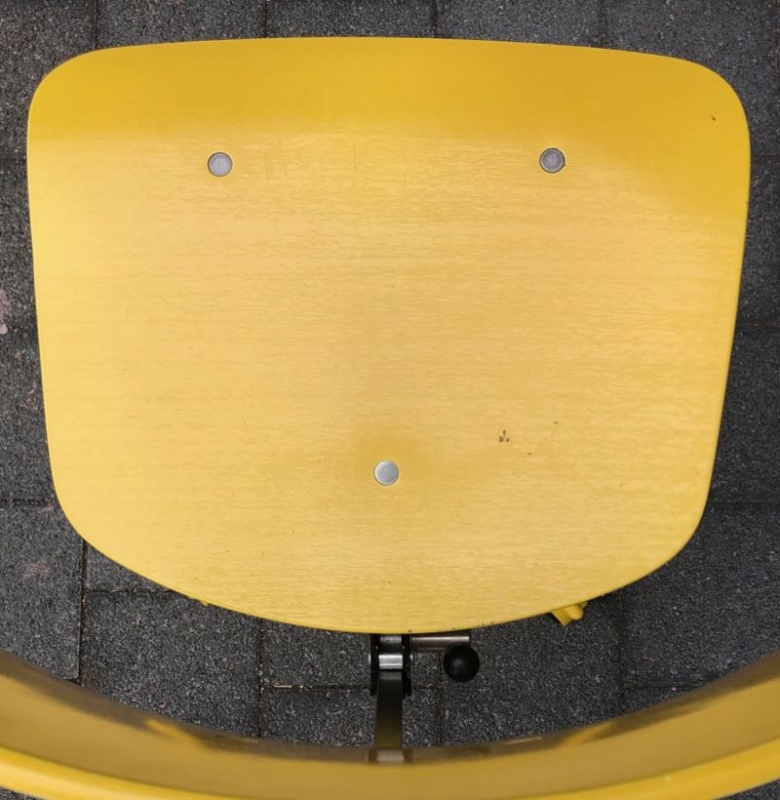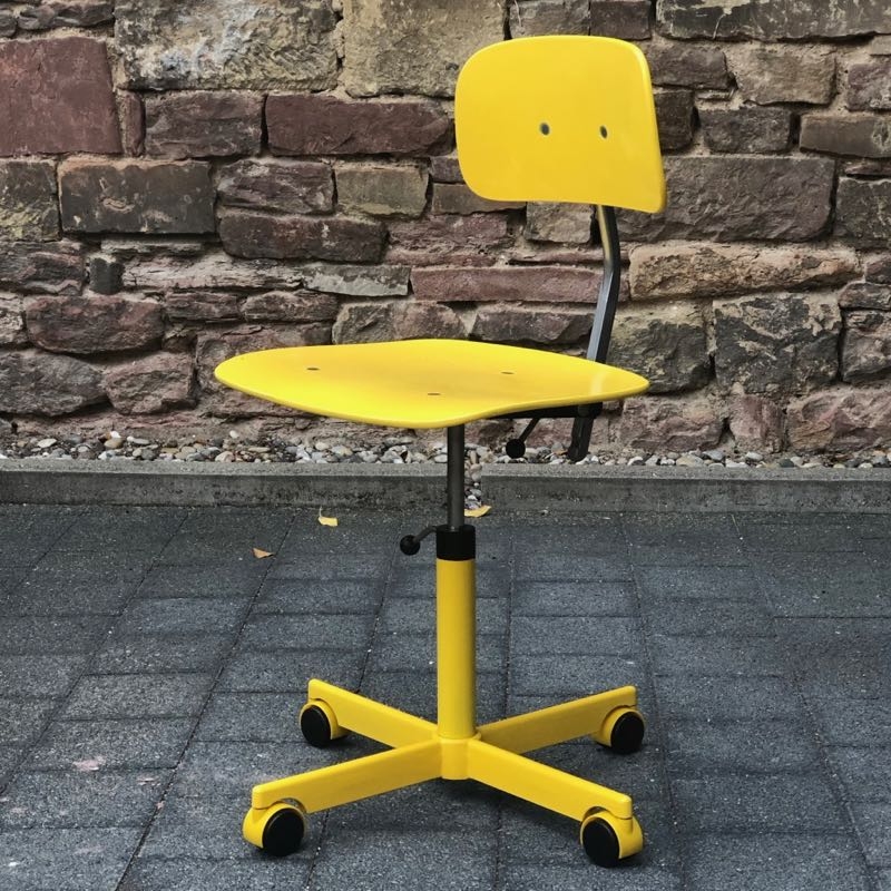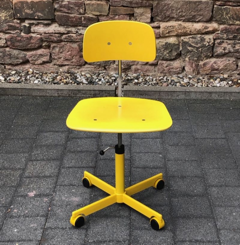 …..vintage KEVI SCHREIBTISCHSTUHL für Kinder, KEVI A/S Denmark 50s/60s….. Entwurf von Jørgen Rasmussen Metallgestell, Lehne und Sitzfläche aus Holz, quietschgelb lackiert Breite + Tiefe 39.5cm, Höhe verstellbar guter vintage Zustand verkauft/sold