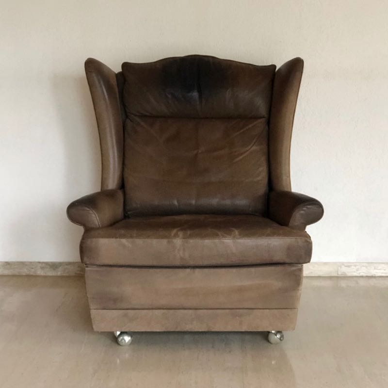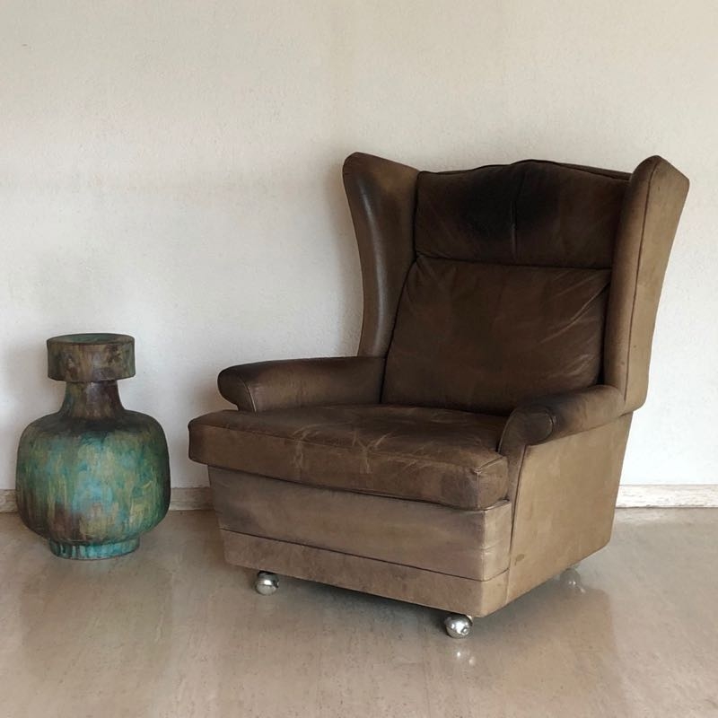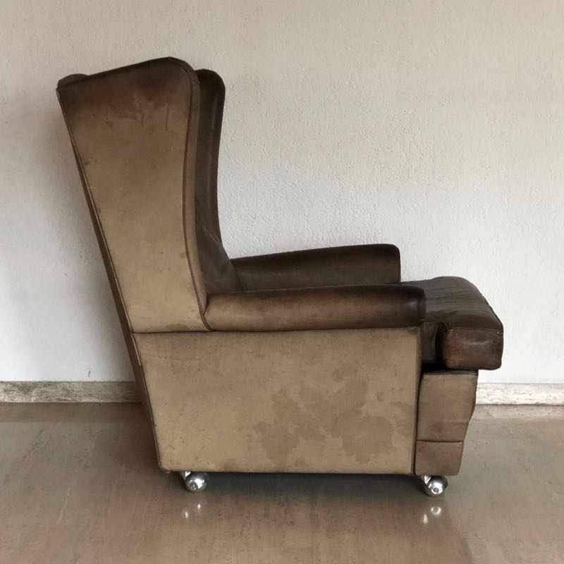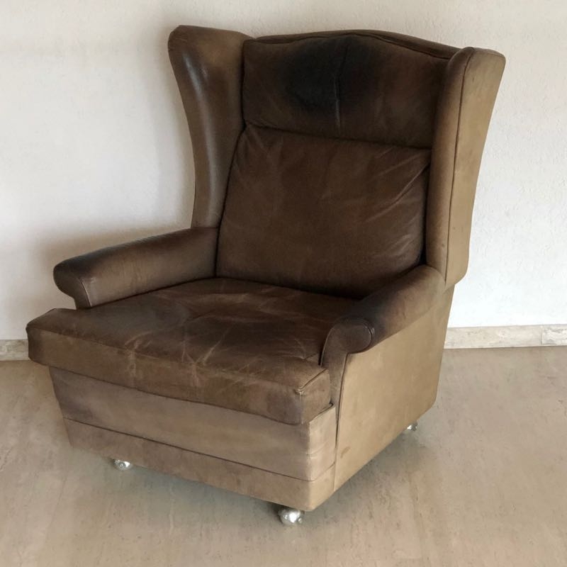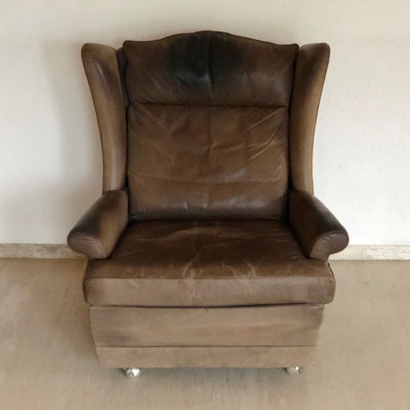 …..vintage OHRENSESSEL, 60er Jahre….. braunes Wasserbüffelleder HxBxT: 97 x 86 x 97cm, Sitzhöhe 42cm auf Rollen vintage Zustand mit Patina verkauft/sold