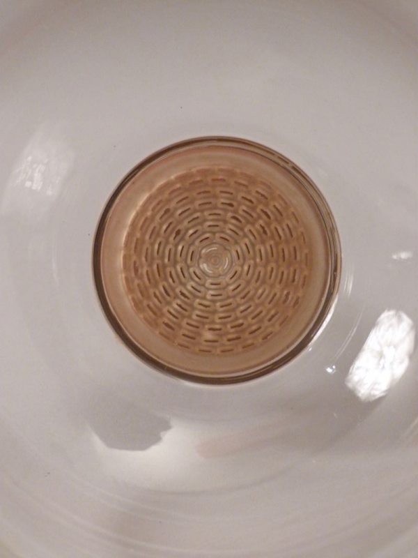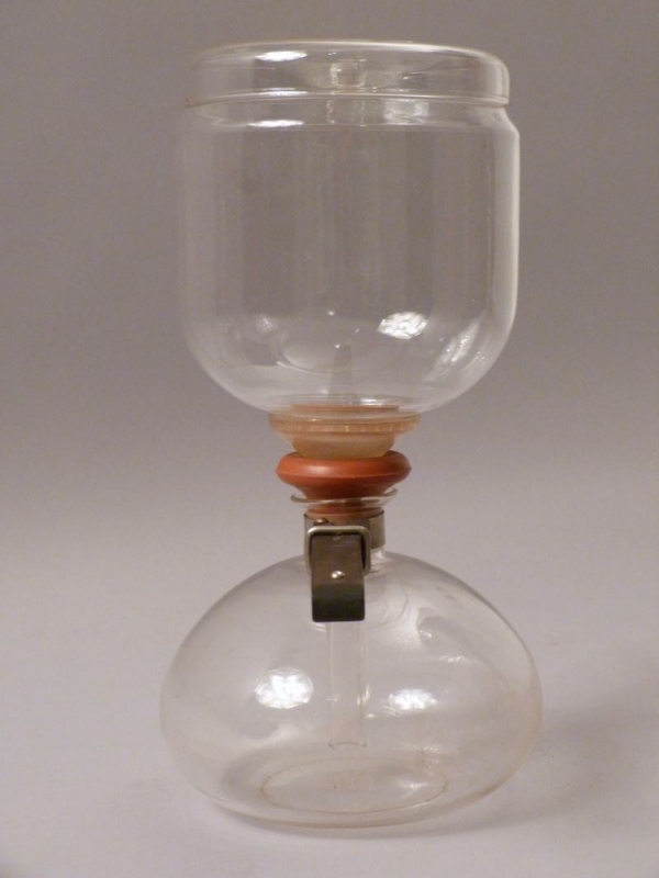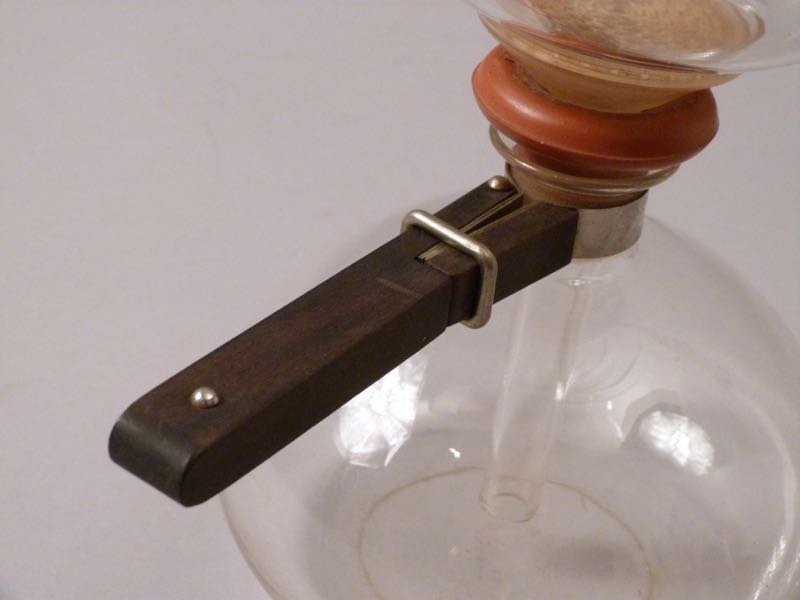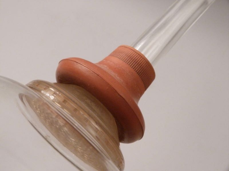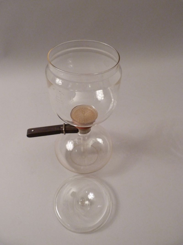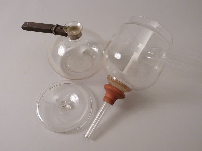 Material: farbloses, hitzebeständiges Glas, Griff aus Ebenholz, Federring aus Stahl, rote Gummidichtung