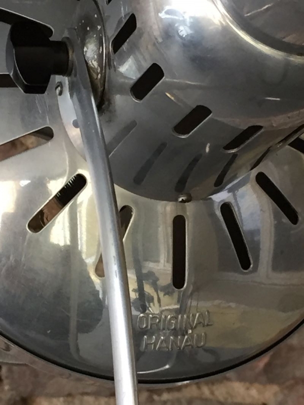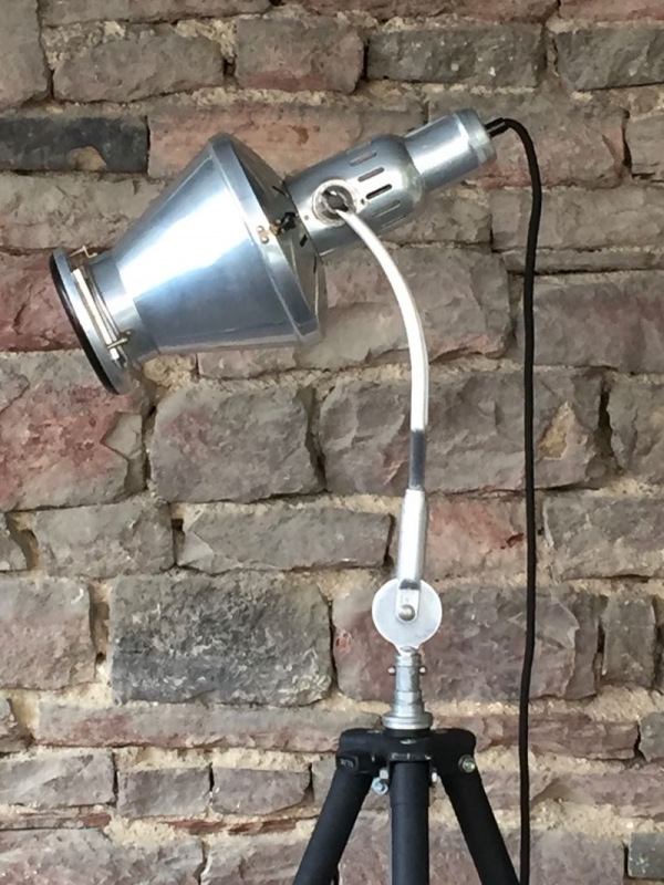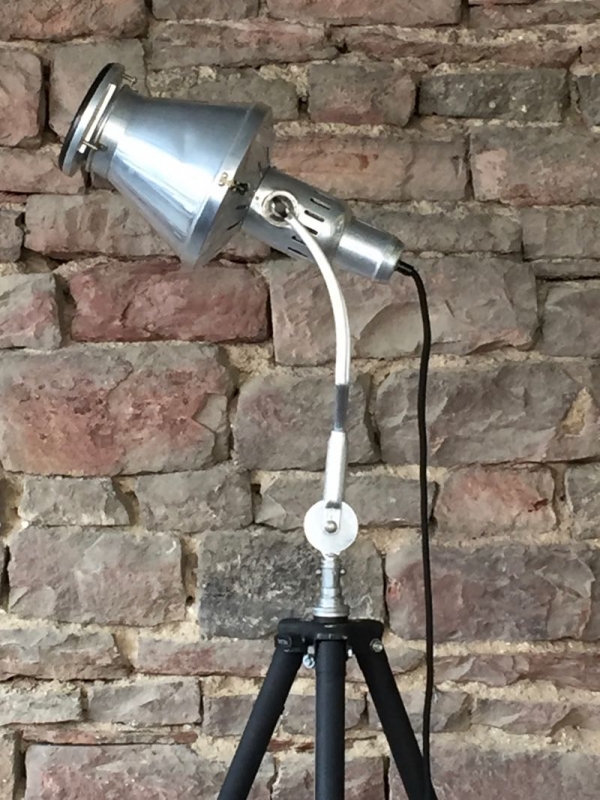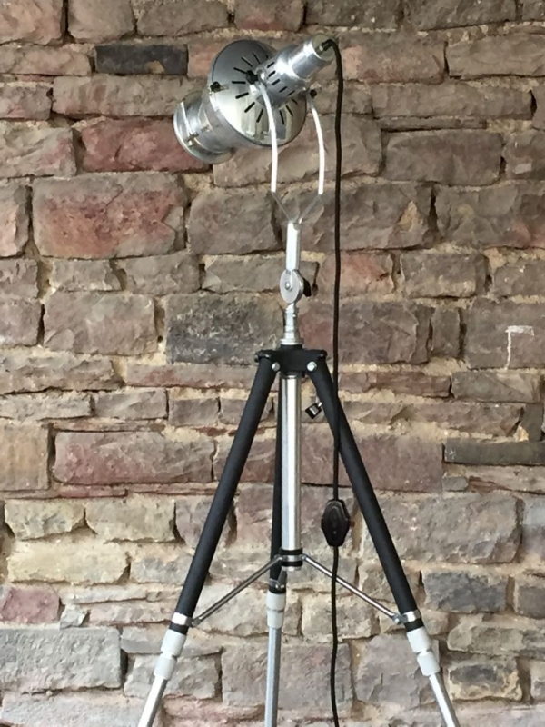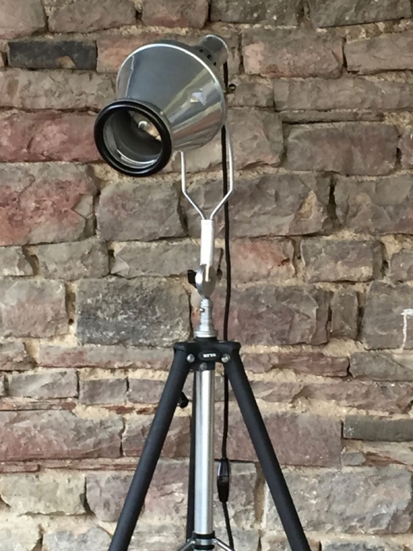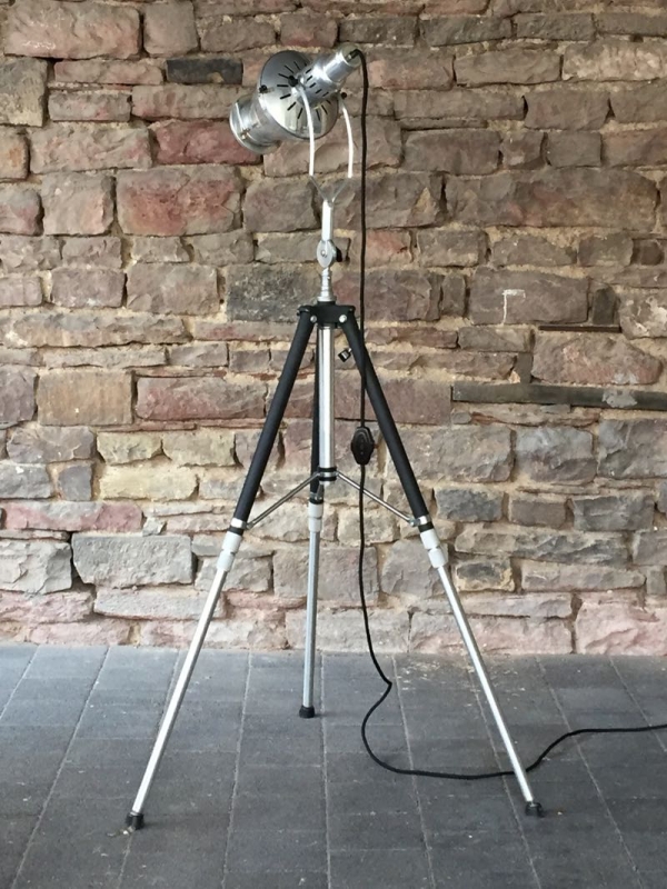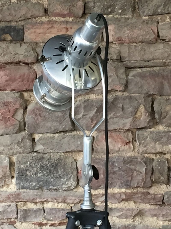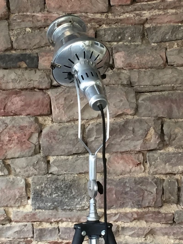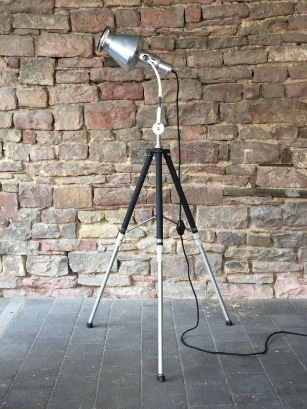 …..vintage TRIPOD-STEHLAMPE, Hanau Wärmelampe auf altem Fotostativ….. Höhe verstellbar schwarzes Textilkabel mit Bakeltschalter verkauft/sold