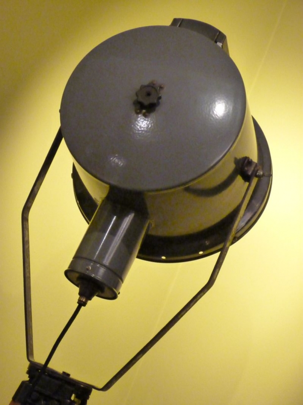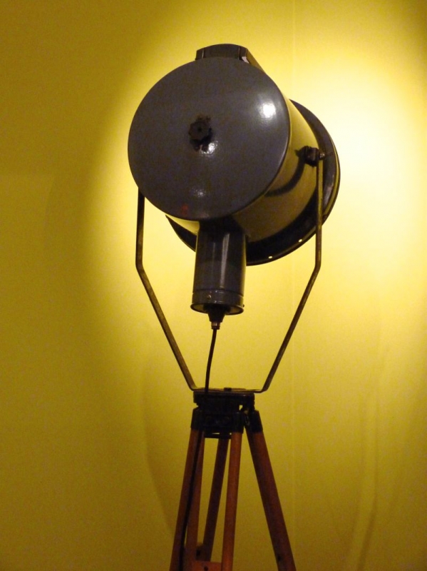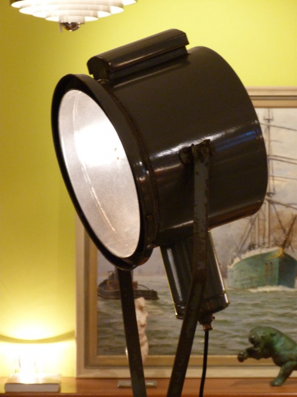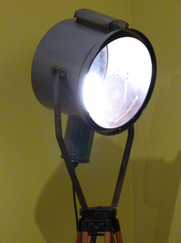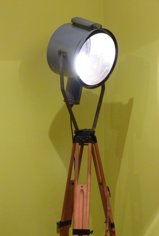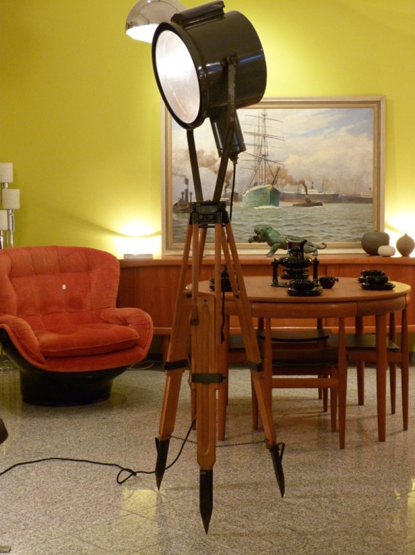 …..vintage TRIPOD STEHLAMPE Industrial Design, alter Baustrahler auf Holzstativ…..