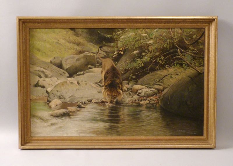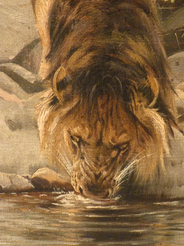 …..WILHELM KUHNERT, Ölgemälde ~ 1920, Löwe an der Tränke….. * 1865 in Oppeln – † 1926 Flims/Graubünden Öl auf Leinwand/doubliert 39.5 x 62cm rechts unten signiert Rahmen 46 x 69cm verkauft/sold